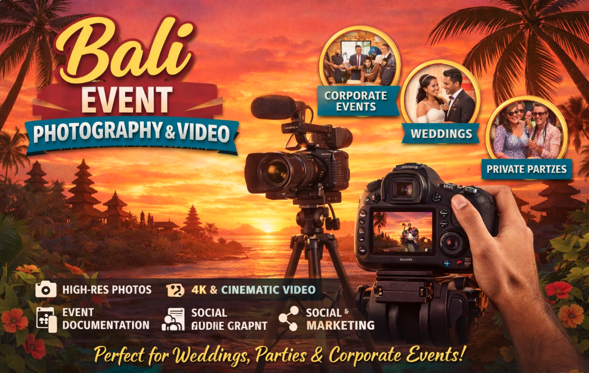 Bali Event Photo & Video Service provides professional photography and videography for events across Bali. Our experienced team captures every important moment with high-quality cameras, creative angles, and professional lighting to ensure your event memories last forever.