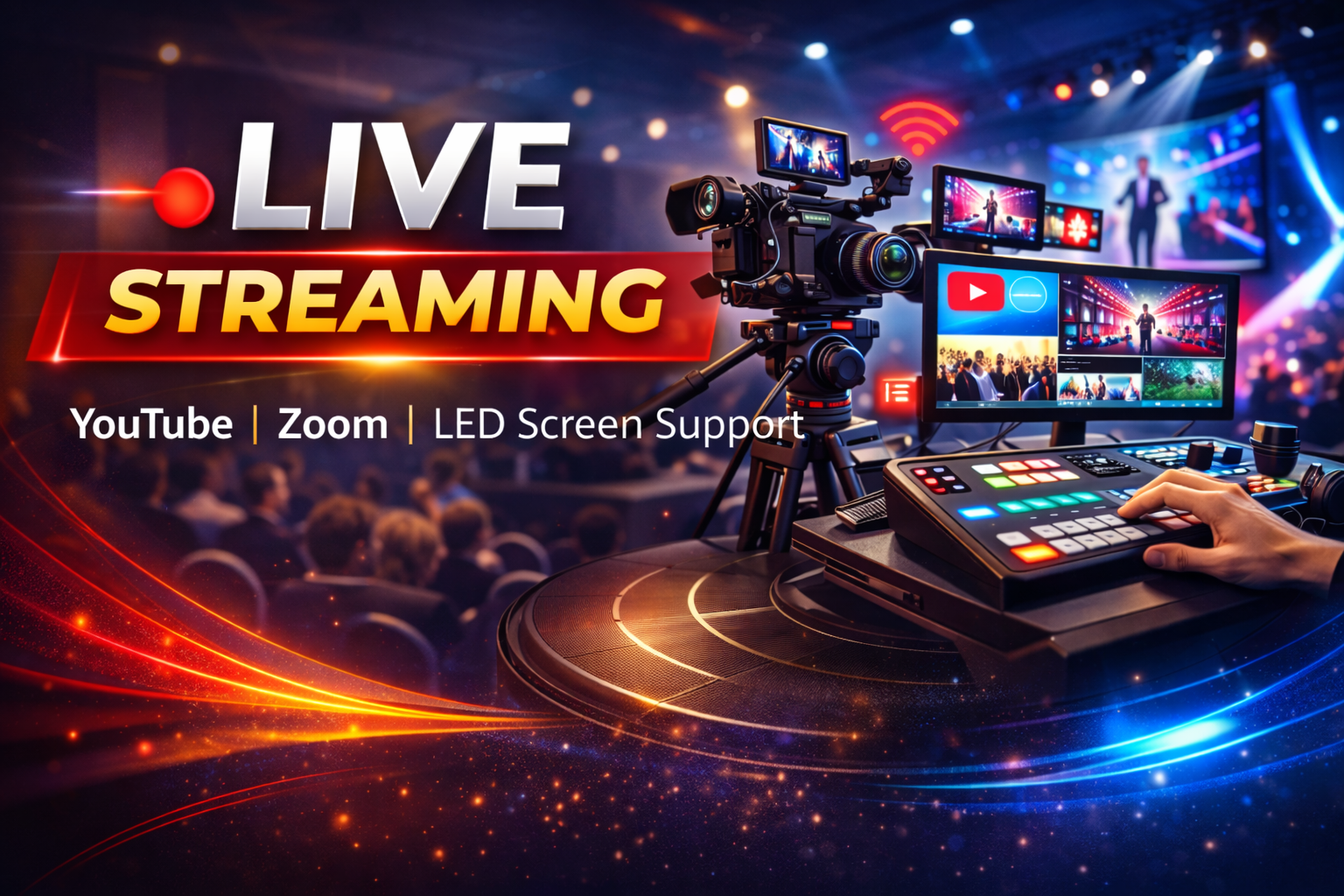 Our live streaming service is perfect for corporate events, conferences, weddings, seminars, product launches, concerts, religious events, and hybrid meetings. We help businesses and event organizers reach global audiences through platforms such as YouTube Live, Zoom, Facebook Live, Instagram Live, and private streaming platforms.
