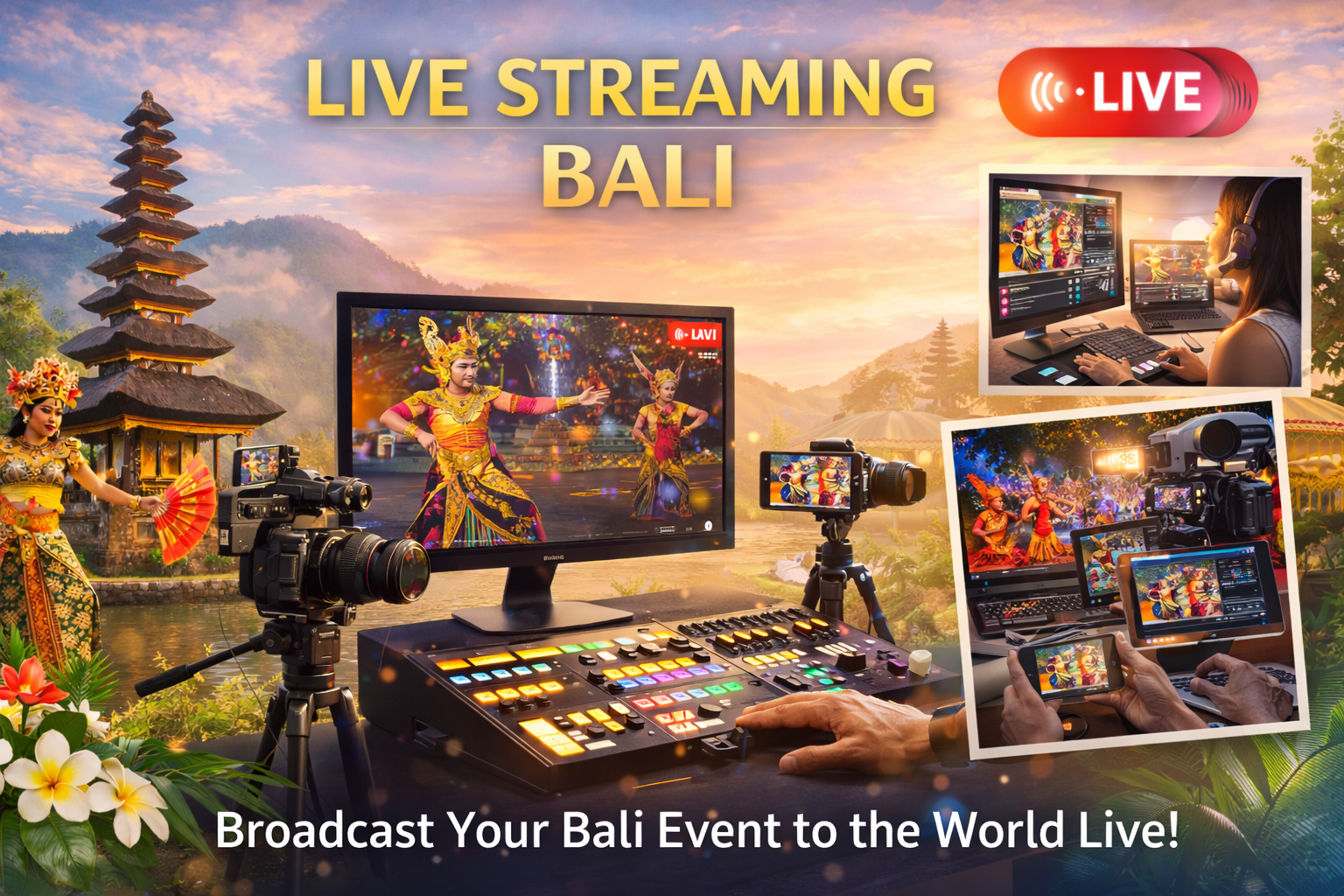 Bali Live Streaming Service provides professional live streaming solutions for events in Bali. With high-quality broadcasting equipment and an experienced technical team, we ensure your event can be watched live by audiences anywhere in the world.